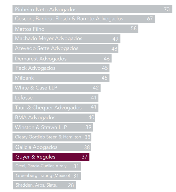 De acuerdo con la investigación Who Represents Latin America's Biggest Companies 2024? desarrollada por LACCA*, Guyer & Regules es la firma uruguaya más destacada en la región, superando a otras firmas al asesorar a 37 de las 100 empresas más importantes de América Latina.